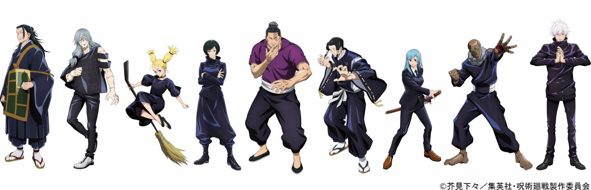 Dentre os personagens que foram revelados estão: a professora Utahime Iori, e os alunos Mechamaru, Momo Nishimiya e Noritoshi Kamo. A segunda parte da primeira temporada vai chegar no início de janeiro – ao todo, serão 24 episódios. Veja abaixo os personagens e o pôster: