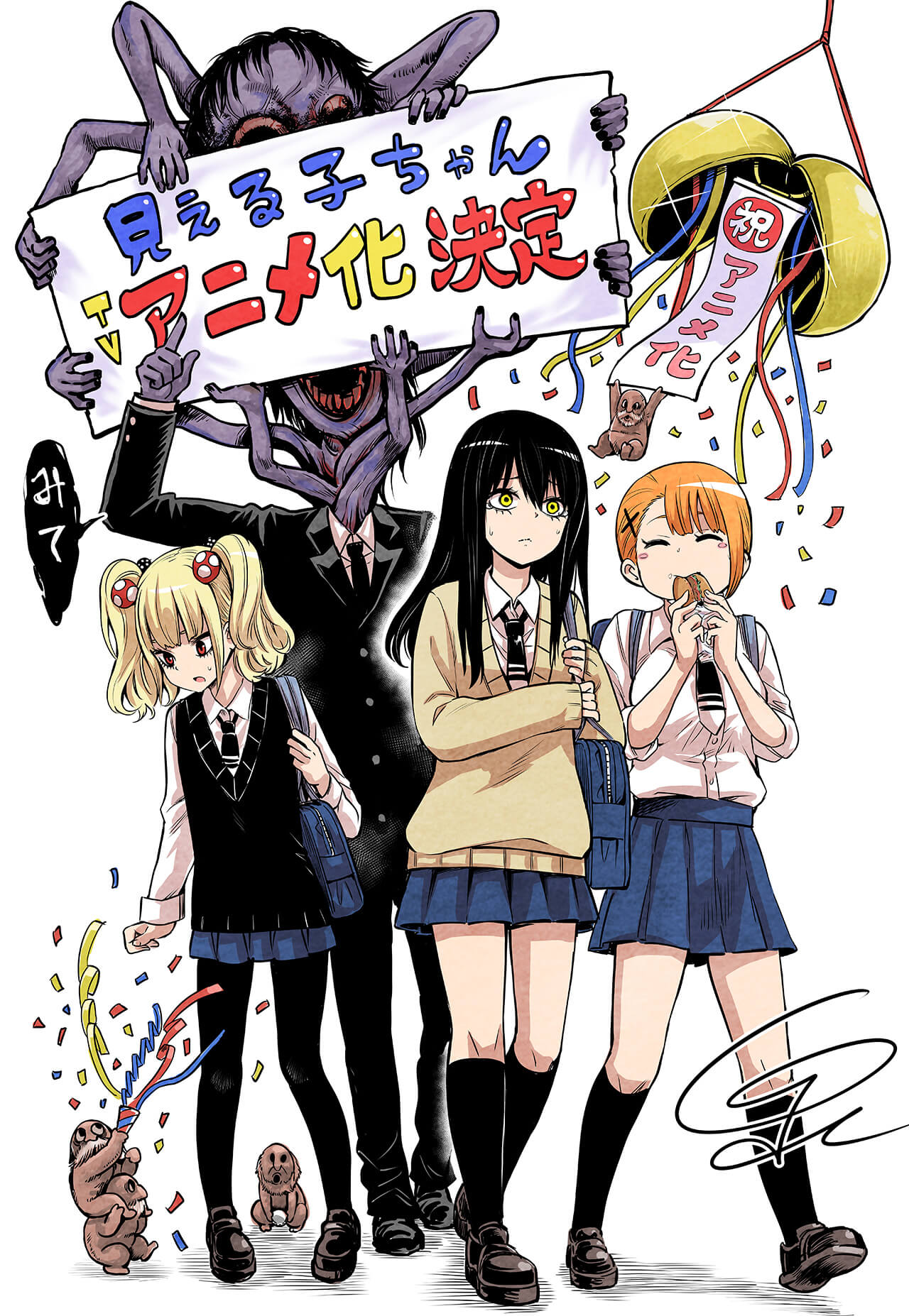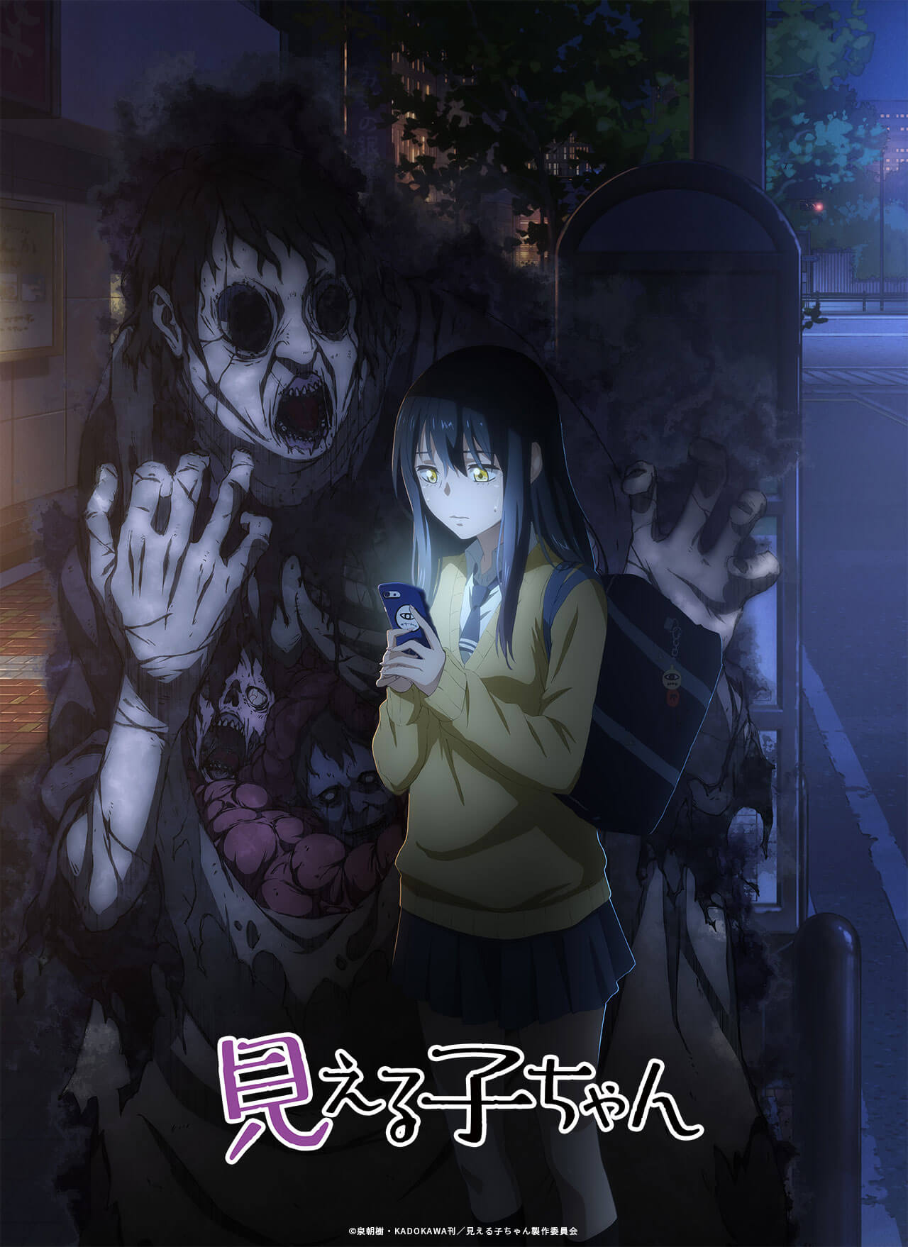 Lançado em 2018 no site ComicWalker, da editora Kadokawa, Mieruko-chan já conta com cinco volumes publicados no Japão. A primeira imagem promocional da animação também foi revelada, junto de uma imagem comemorativa ilustrada por Izumi. Confira as duas imagens abaixo:
