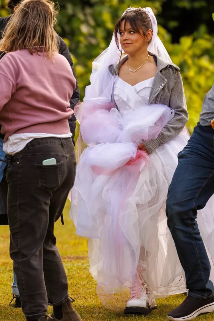 As filmagens estão acontecendo em Hertfordshire, na Inglaterra, e Ortega usa um vestido branco de noivado muito parecido com o que Ryder, que retorna como Lydia Deetz, usou no filme original. Ortega interpreta a filha de Lydia. Confira:
