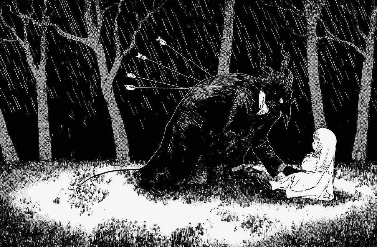 Acontece que o amável Sensei, cuidador da pequena Shiva, é um amaldiçoado. Uma criatura com feições que lembra um bode no melhor estilo Black Phillip, do filme A Bruxa, ou para os leitores de mangá, o Elias de The Ancient Magus Bride, mas com um olhar expressivo e fraterno. E seu cuidado com a Shiva é incondicional: ele quer defendê-la, proteger a pequena. E assim, ele a proíbe de andar pela floresta, pois esta pode estar cheia de grandes feras… as pessoas.