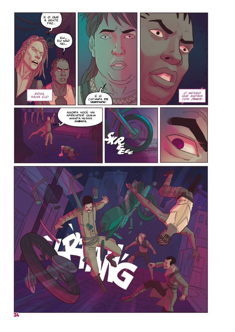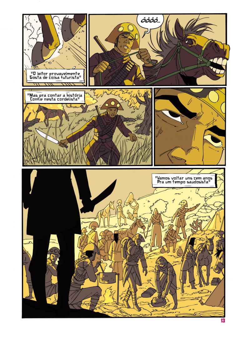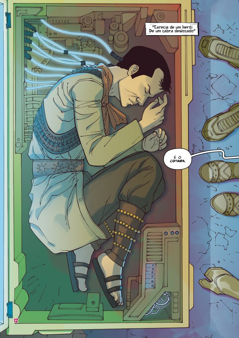 Ponto alto para as cores de Dika Araújo, que brinca com tons neon, que remetem muito ao filme Blade Runner, mas quando somos transladados para o passado do cangaceiro Cotiara, as cores tornam-se áridas e secas, algo que te transporta junto para a atmosfera sofrida do sertão.