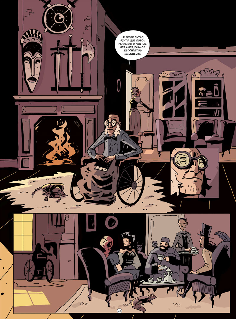 Caso você ainda não tenha conferido as outras histórias no universo steampunk de Le Chevalier (que são o livro A Exposição Universal e a HQ Arquivos Secretos) não precisa se acanhar em conferir essa obra: logo de início temos um pequeno guia de cada personagem e suas principais características, algo que já serve para ter uma base sólida antes de ler Nas Montanhas da Loucura. Logicamente, o ideal mesmo é acompanhar a série de acordo com o lançamento.