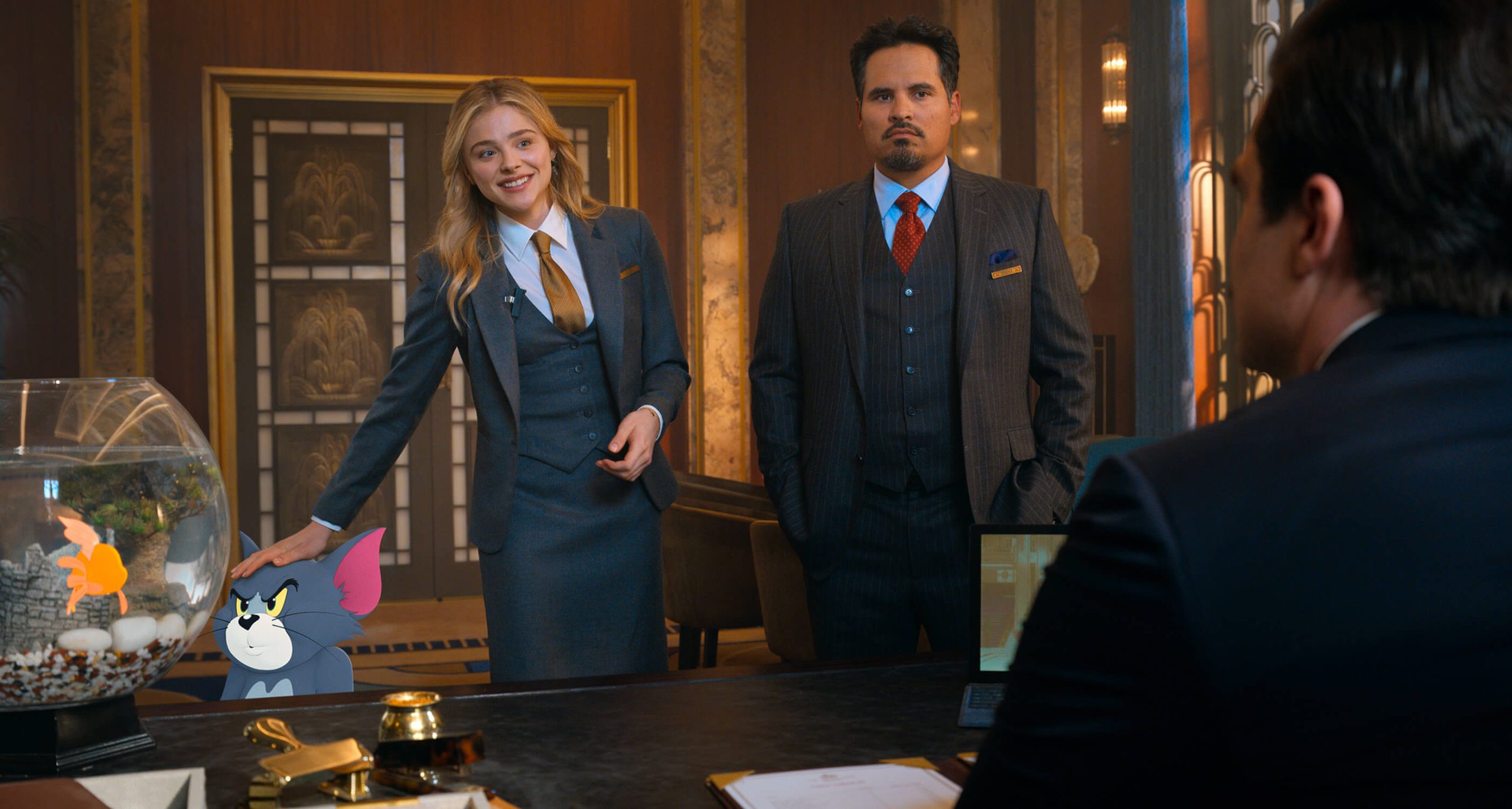O roteiro é muito certeiro ao conseguir criar personagens adultos que pareçam estar em um filme adulto. Não é porque estão cercados de desenhos animados que as falas devem ser abobalhadas e os atores foram muito bem dirigidos para impedir qualquer excesso. Diferente de outros filmes infantis, até mesmo a forçada piada de pum se torna engraçada, pois não é a graça principal de todo o ato. Por mais que a história do casamento entre o extravagante Ben (Colin Jost) e da romântica Preeta (Pallavi Sharda) ganhe um bom destaque, não tira o foco dos protagonistas e nem se torna sacal para o público infantil. Kayla, que é uma junção da personalidade de Tom – espertalhão e insistente – e Jerry – resolutivo e sagaz, apresenta um drama bem simples e que, por mais artificial que seja, dá para aceitar a conclusão de sua trama.