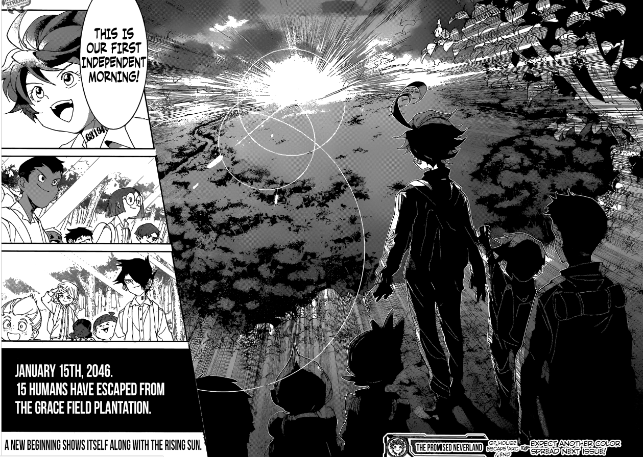 Esse primeiro volume se encerra de uma maneira que lhe faz gritar pelo próximo, porém, sem deixar pontas soltas ou mal amarradas. A construção do orfanato e seu sistema de funcionamento é simplesmente incrível. Já na arte temos outra obra prima, desde os cenários bem detalhados quando preciso até o número de identificação das crianças, além das suas feições, rostos e expressões, muito bem diferenciados. Um mangá altamente recomendado para quem gosta de fantasia, thriller, ação e drama de primeira qualidade!