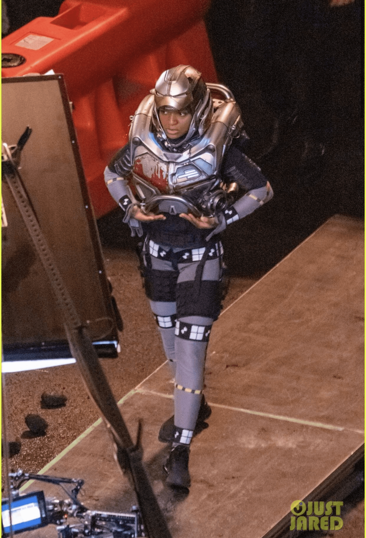 O Just Jared divulgou imagens inéditas dos bastidores de Coração de Ferro, nova série da Marvel, mostrando o visual da primeira armadura de Riri Williams, personagem de Dominique Thorne.