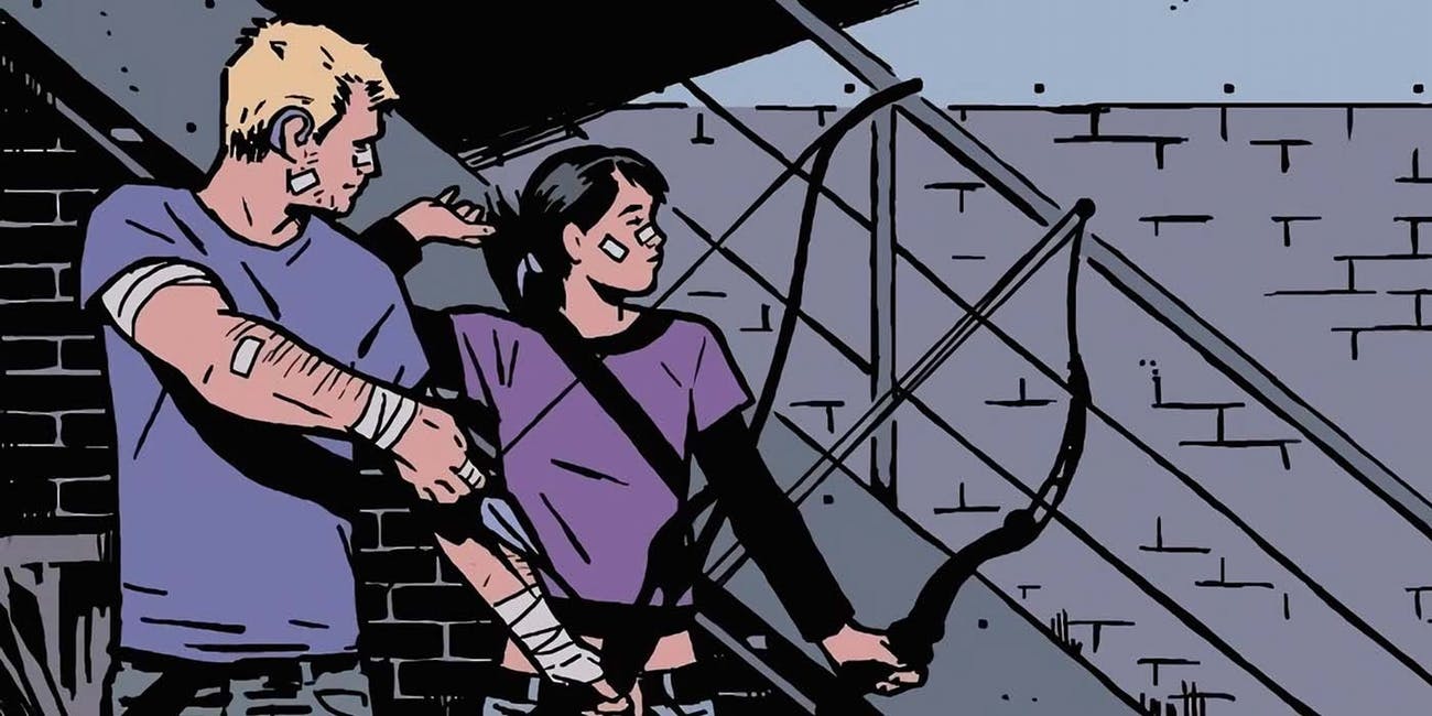 Kate Bishop surgiu nos quadrinhos da Marvel Comics como a Gaviã Arqueira, membro dos Jovens Vingadores, mas em diversos momentos teve sua parceria com Clint Barton. Há uma cena divulgada de Vingadores: Ultimato que indica sua presença no filme: